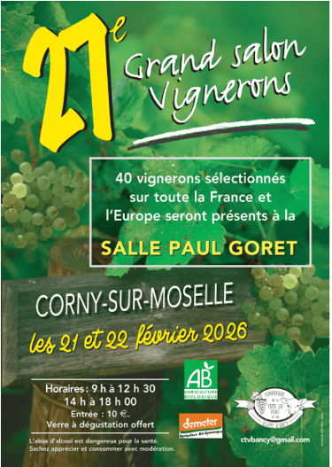 Salon des Vignerons – Corny-sur-Moselle 2026 : Les 21 et 22 février 2026, retrouvez le Domaine Goisot au Grand Salon des Vignerons de Corny-sur-Moselle.