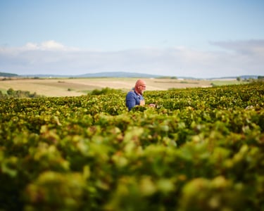 Situées entre 180 et 225 m d’altitude, les parcelles bénéficient d’une exposition septentrionale (avec micro-climat), orientée nord / nord-nord-ouest, sous l’influence d’un vent dominant de nord-est. Le vignoble est conduit en agriculture biologique et bio-dynamique, certifiée ECOCERT sas et Demeter, pour un rendement moyen de 40 hl/ha. La vendange est triée manuellement sur table, entièrement égrappée, puis soumise à un pressurage lent et un débourbage sévère. La fermentation en levures indigènes et la fermentation malolactique spontanée sont suivies d’un élevage sur lies fines en fûts de 500 L (1 à 6 vins) pendant 15 à 19 mois, sans bâtonnage, avec une utilisation très modérée du SO₂, réajustée seulement si nécessaire à la mise en bouteille.